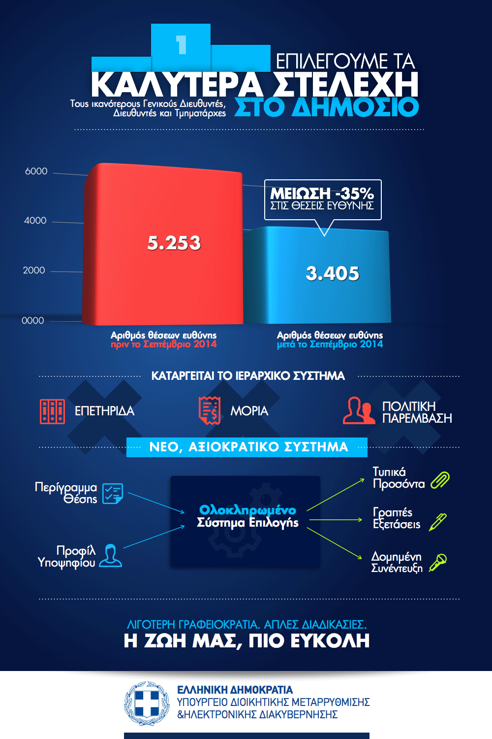 Καινοτομίες Σύμφωνα με το υπουργείο Διοικητικής Μεταρρύθμισης, «βασικό στοιχείο του νέου συστήματος επιλογής αποτελεί η κατάργηση της μοριοδότησης των «στατικών» χαρακτηριστικών των υπαλλήλων (πτυχία, πιστοποιητικά κ.λπ.) που αποτελούσε το κύριο, αν όχι αποκλειστικό, κριτήριο για την επιλογή προϊσταμένων και η ενεργοποίηση γραπτών εξετάσεων και δομημένων συνεντεύξεων.