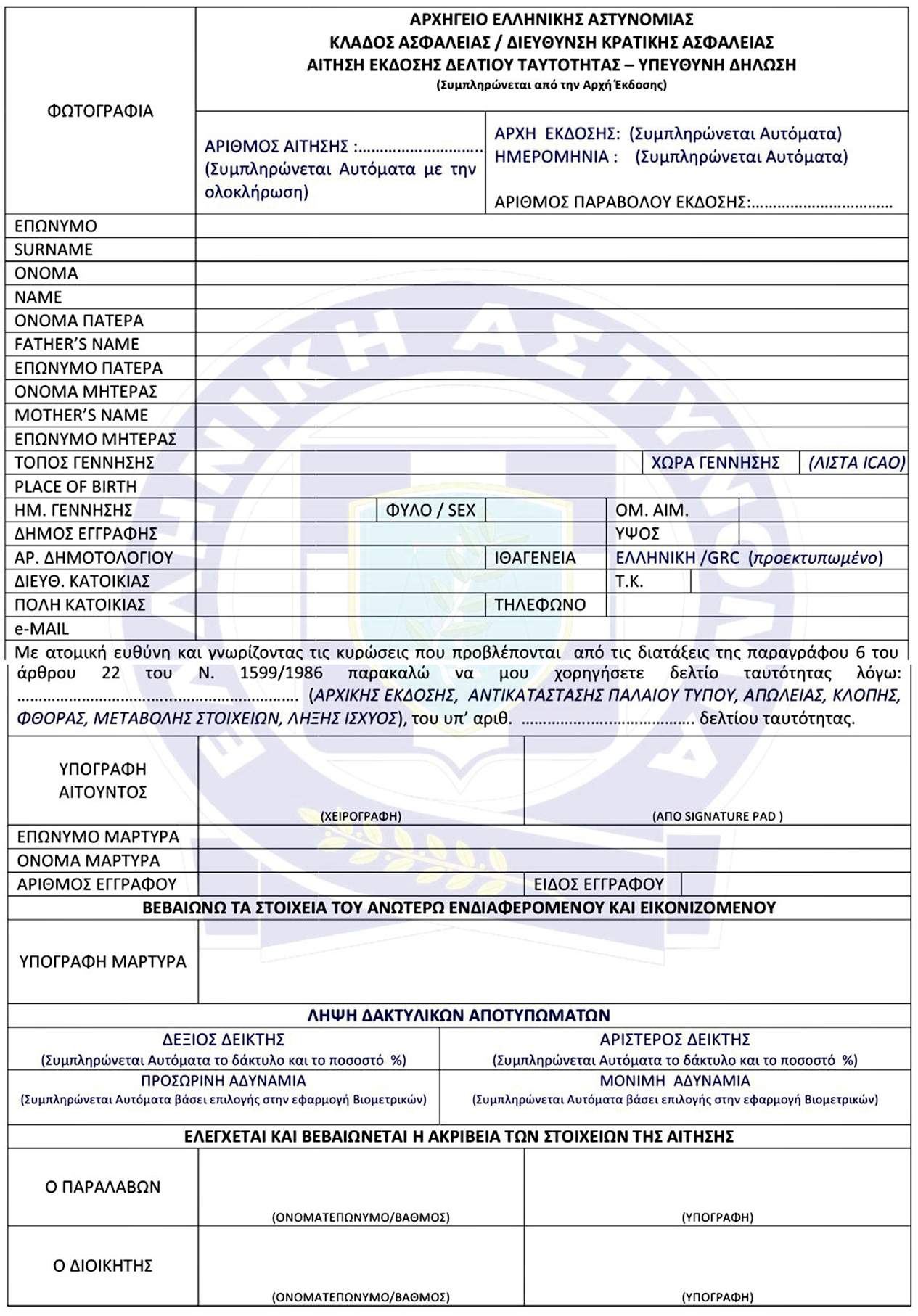 * Στο συνημμένο αρχείο θα βρείτε την αίτηση για την έκδοση νέας ταυτότητας.