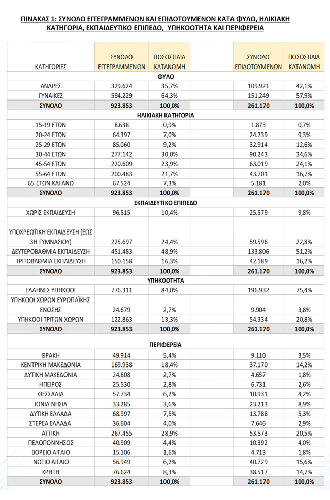 Μεταξύ των Περιφερειών της χώρας η Περιφέρεια Αττικής και η Περιφέρεια Κεντρικής Μακεδονίας καταγράφουν τον μεγαλύτερο αριθμό εγγεγραμμένων: 267.455 άτομα (28,9%) και 169.938 (18,4%), αντίστοιχα.