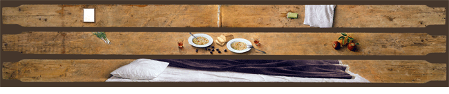 Στο πρώτο μέρος της έκθεσης, ξαπλωμένες ανθρώπινες φιγούρες, ακραία παραστατικές, δηλώνουν την παρουσία τους με δυναμισμό και προκαλούν τον επισκέπτη να ταυτιστεί μαζί τους, να αναγνωρίσει ίσως οικεία πρόσωπα, σπαράγματα του ατομικού και συλλογικού μας βίου. Μια μισάνοιχτη πόρτα φωτός χωρίζει τα δυο μέρη της έκθεσης. Στο δεύτερο μέρος, τα στοιχειώδη, είναι τα απολύτως αναγκαία, αλλά ταυτόχρονα τα επαρκή και ικανά να ορίσουν εκ νέου το χαμένο Μέτρο στα ζητούμενα του ανθρώπου: ’’λίγο φαί, νερό να ευπρεπιστούμε, ένα κατάλυμα, μια πόρτα ανοιχτή’’.