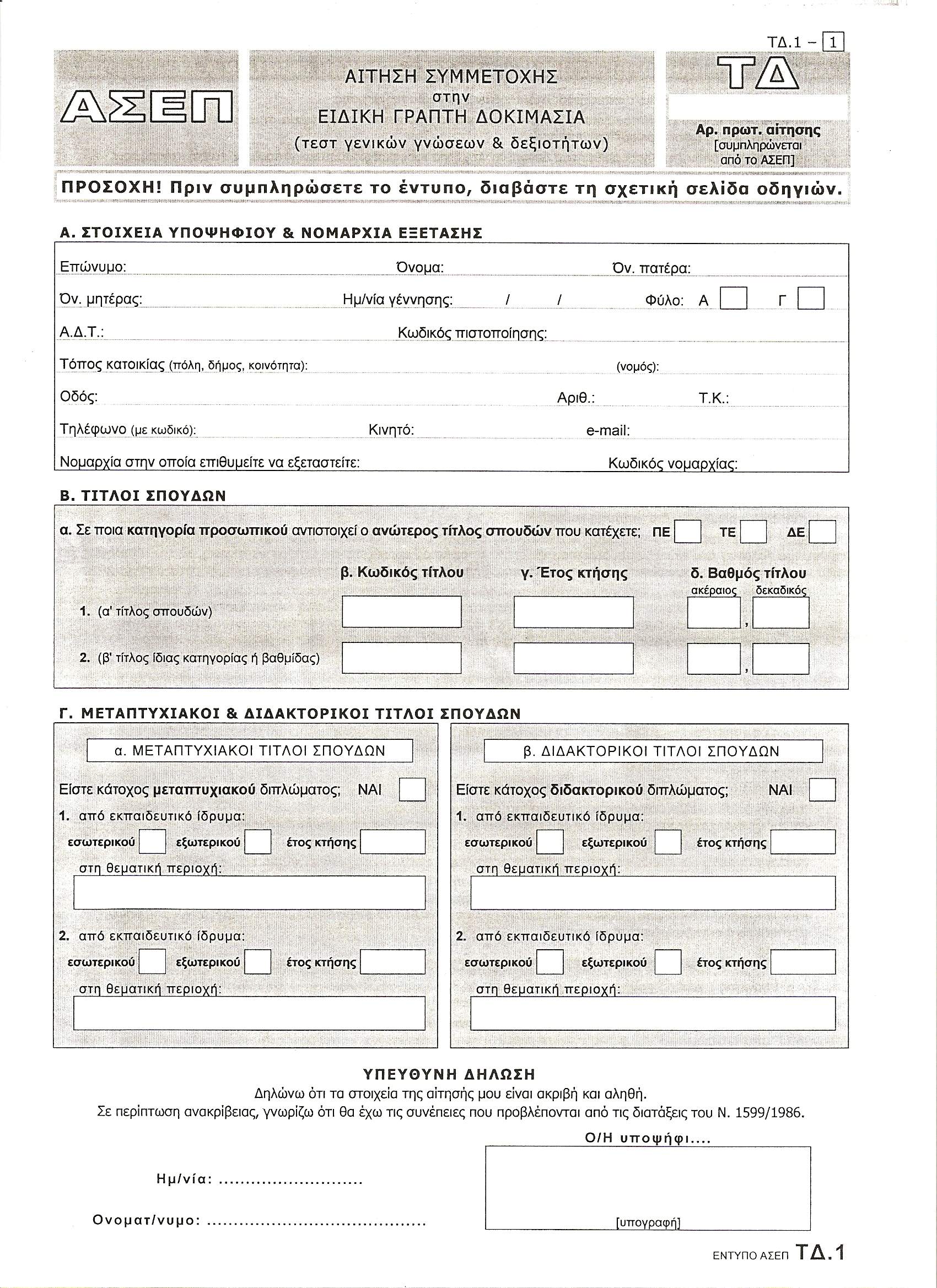 Το έντυπο της αίτησης θα διατίθεται δωρεάν από τις Νομαρχίες και τα Επαρχεία της χώρας, καθώς και από τον δικτυακό τόπο του ΑΣΕΠ www.asep.gr.