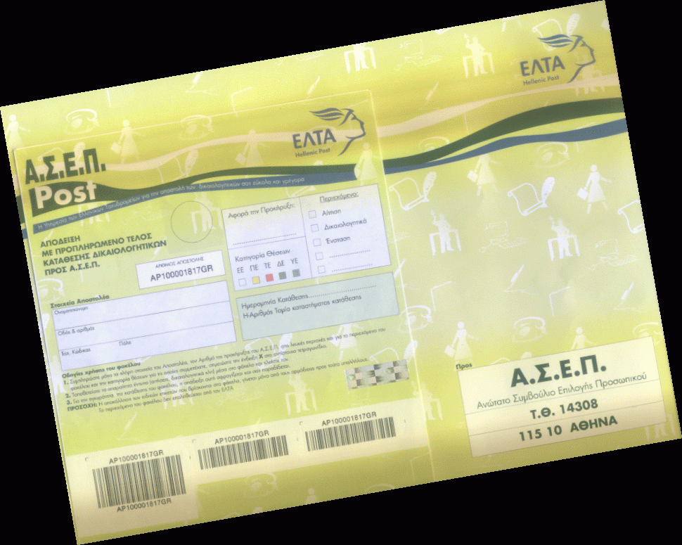 Aθήνα 1.7.2005 Τον ειδικό ταχυδρομικό φάκελο του ΑΣΕΠ τον οποίο θα χρησιμοποιούν στο εξής οι υποψήφιοι των διαδικασιών πρόσληψης, παρουσιάζει η proslipsis στο συνημμένο αρχείο.