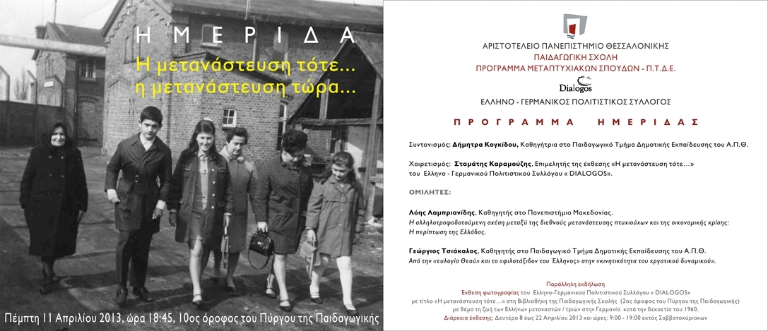 Παράλληλη εκδήλωση Παράλληλη εκδήλωση θα είναι η έκθεση φωτογραφίας του Ελληνο–Γερμανικού Πολιτιστικού Συλλόγου «DIALOGOS», με τίτλο «Η μετανάστευση τότε…» στη Βιβλιοθήκη της Παιδαγωγικής Σχολής (2ος όροφος του Πύργου της Παιδαγωγικής), με θέμα τη ζωή των Ελλήνων μεταναστών/τριών στη Γερμανία κατά την δεκαετία του '60 (Δευτέρα 8 έως 22 Απριλίου 2013 και ώρες 9:00 -19:00, εκτός Σαββατοκύριακων).