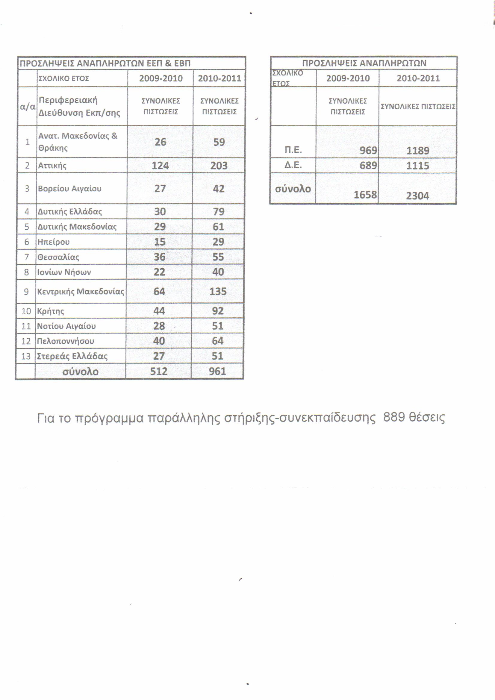 * Στο συνημμένο αρχείο θα βρείτε πίνακα με συγκριτικά στοιχεία με τις προσλήψεις αναπληρωτών στα Ειδικά Σχολεία ανά Περιφερειακή Διεύθυνση Εκπαίδευσης για τα σχολικά έτη 2009 - 2010 και 2010 - 2011.