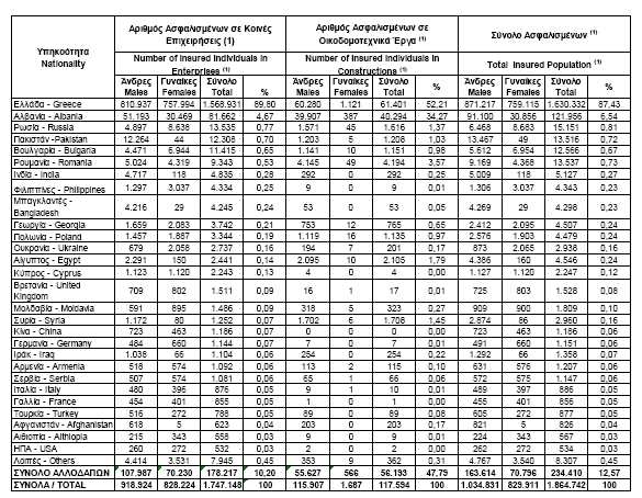 Το σύνολο των ασφαλισμένων στο ΙΚΑ ανέρχεται σε 1.864.743. Από αυτούς 1.568.931 είναι Έλληνες, 81.662 Αλβανοί και 96.555 υπήκοοι άλλων κρατών.